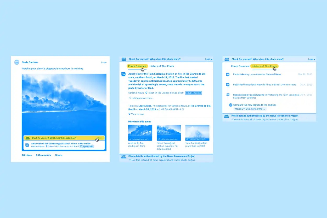 The following year, the team developed a prototype with the Content Authenticity Initiative that uses secure sourcing, a cryptographic approach to give viewers confidence in the origin of a photo. This technology can be easily used by a wide range of journalists by integrating these established prototypes into their news content.
